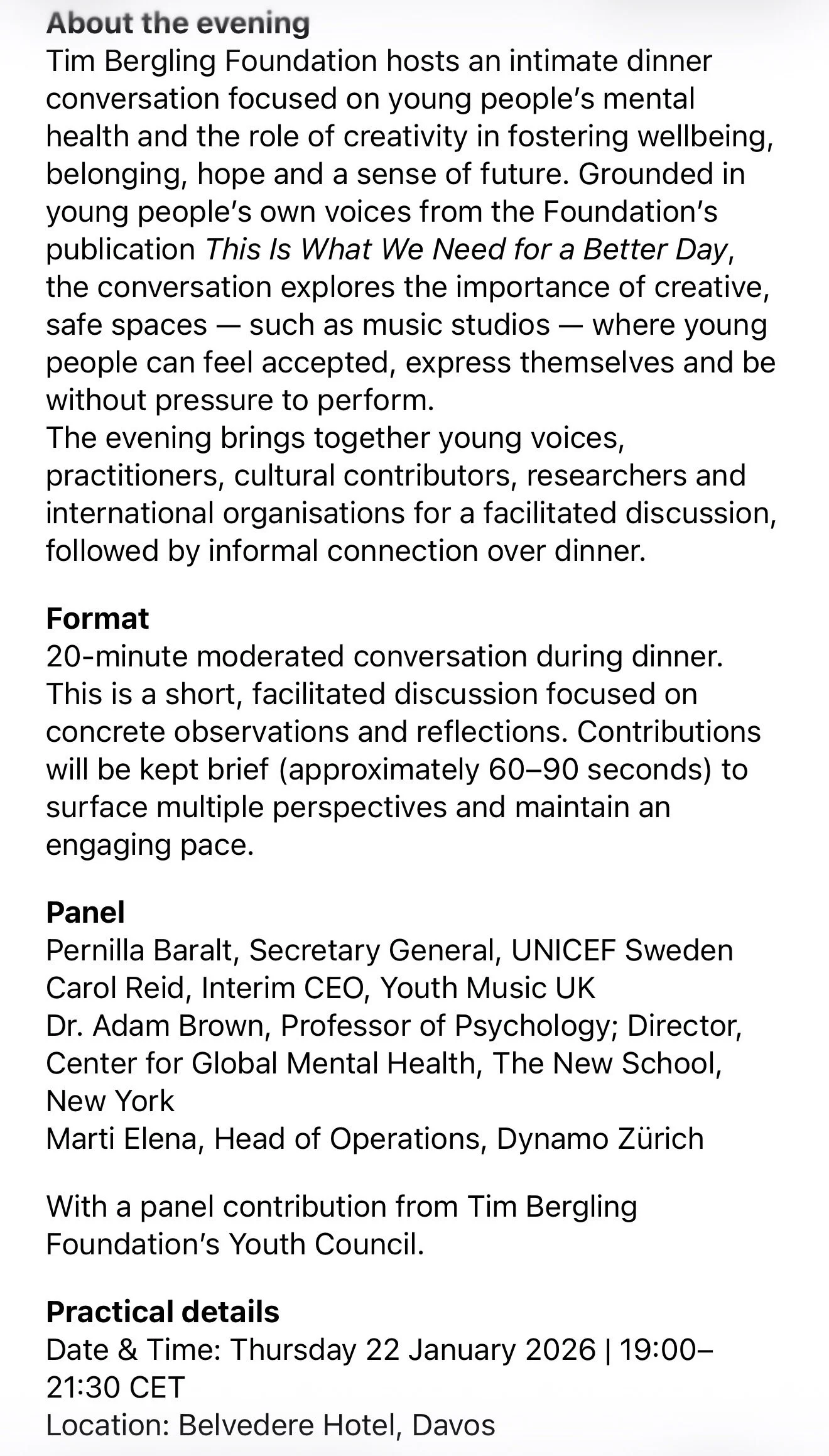 Selected for the Youth to the Table Davos Youth Delegation for the 2026 World Economic Forum: Roundtable Participant (SAP House), Moderator (Tim Bergling (Avicii) Foundation), Newsweek AgriTech Invited Speaker