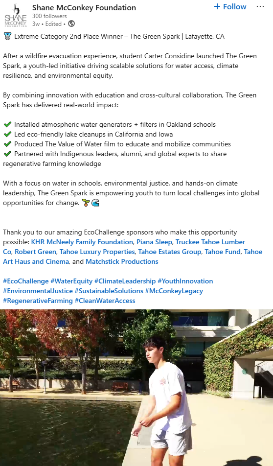 The Green Spark awarded the Shane McConkey Foundation 2025 EcoChallenge Winner